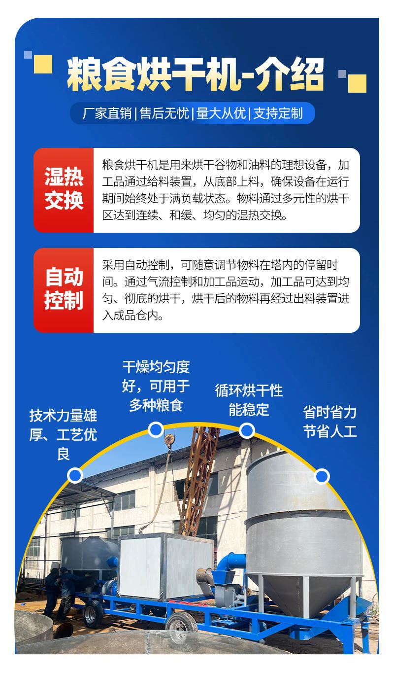 3、農(nóng)村谷物烘干塔多為小型,方便快捷、投資少并能保證谷物干燥品質。玉米烘干機應用先進測控技術,實現(xiàn)干燥過程向自動化或半自動化方向發(fā)展。