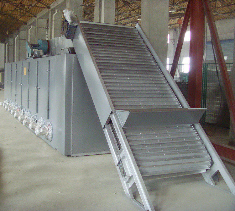3、熱風(fēng)由底部進(jìn)入,下部壓力大于上部壓力,逐層穿過網(wǎng)帶及其上的物料層;