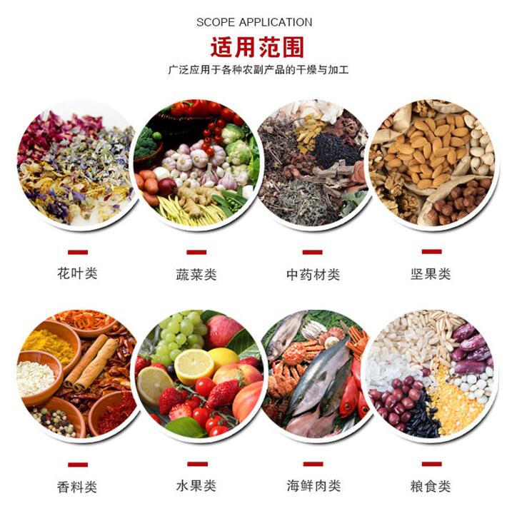 蔬 菜:蘆筍、豆角、蕓豆、扁豆、茄子、紅辣椒、花椒、黑木耳、銀耳、木瓜片、山藥片、苦瓜片、蘿卜(絲、條)、黃瓜片、蘑菇、香菇、姜片、大蒜片等等。